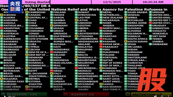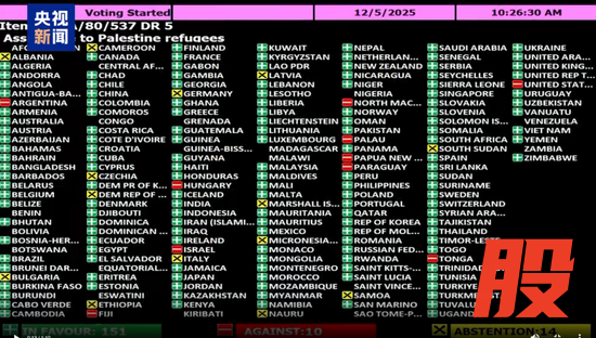 其中,在援助巴勒斯坦难民的相关决议投票中,包括中国、日本、法国、英国、俄罗斯、乌克兰、印度、巴基斯坦等在内的151国投下赞成票,美国、以色列等10国反对,德国、意大利等14国弃权。