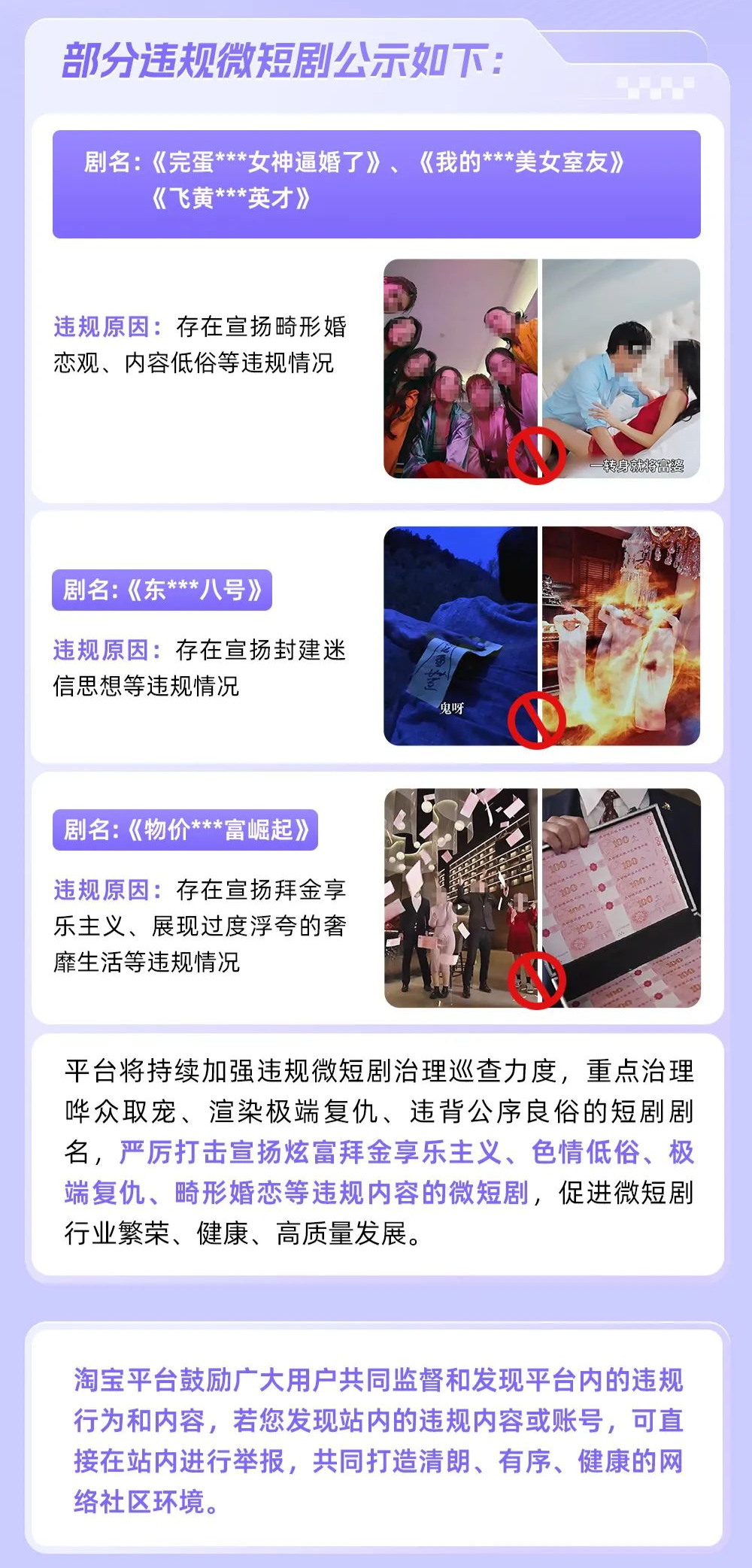 5月9日,“淘宝安全中心”公众号发布《淘宝关于违规微短剧的治理公告(2025年5月)》称,淘宝平台持续优化网络环境,倡导创作者推出创意新颖、内容积极的优质微短剧。通过加强内容审核,与创作者共同营造更清朗的创作生态,为用户带来积极健康的观看体验。4月,淘宝平台下架存在低俗、畸形婚恋、宣扬拜金享乐主义、封建迷信等价值观导向不良问题的微短剧45部。