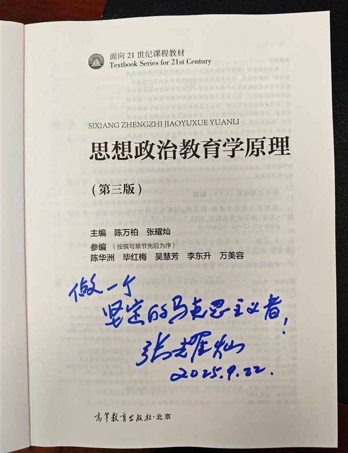 张耀灿教授是我国思想政治教育专业的创始人之一、华中师范大学马克思主义学院教授,也正是该书主编之一。他在扉页上,为新生们写下“做一个坚定的马克思主义者”并落款。